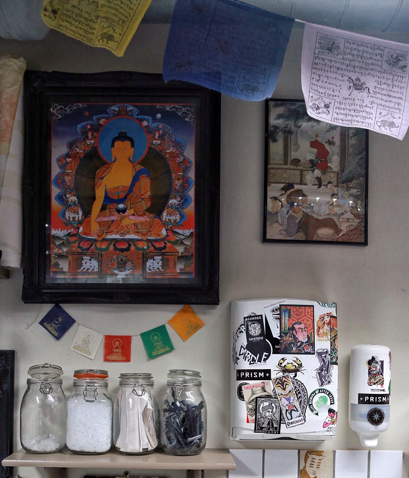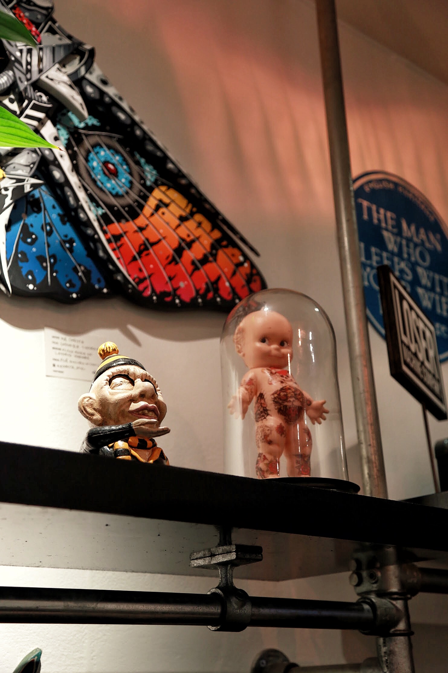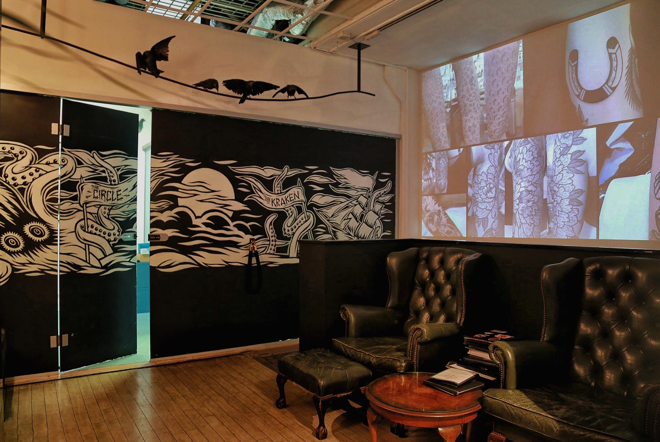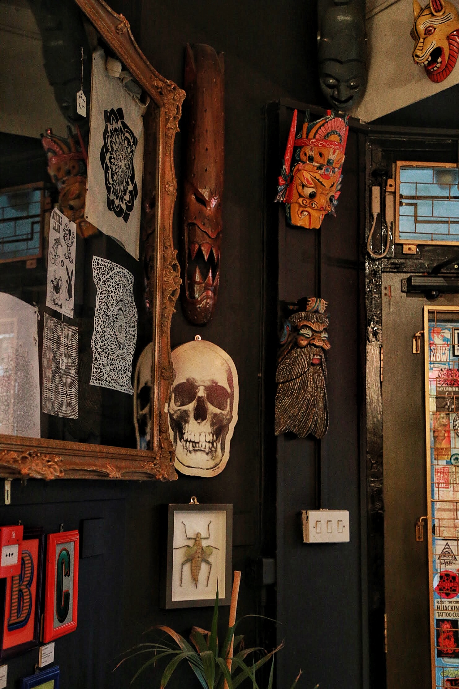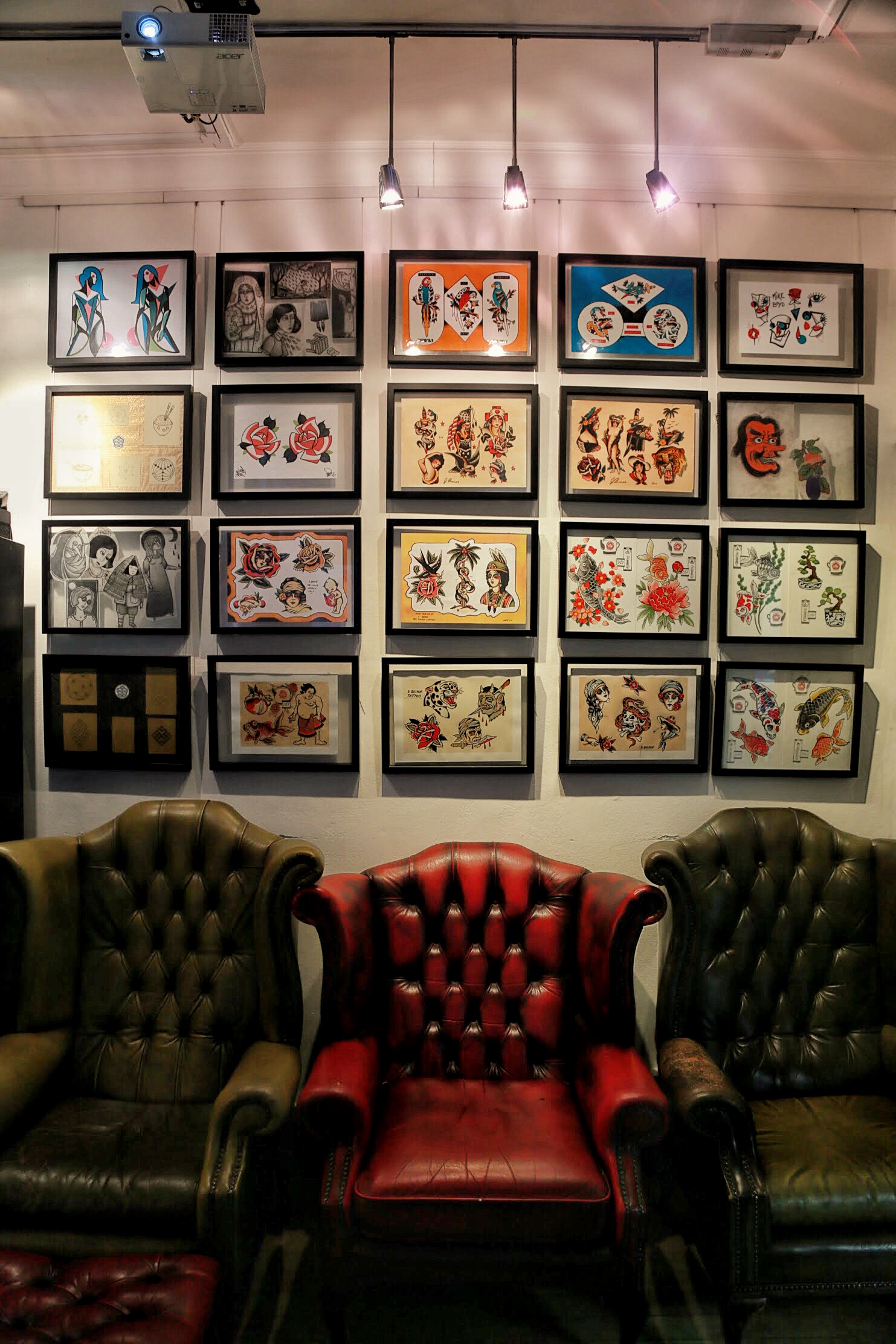As you enter the basement, the mood changes to something more traditional mixed with the distinct smell and ambiance that only a tattoo studio holds. Designed essentially to look like an old fashioned saloon bar and embellished in original artwork from some of the worlds best tattooists, mixed with eccentric ornaments and some intriguing artwork from previous exhibitors of the gallery, the space is packed with creativity and interest. We have a huge team of resident tattooists who specialise in various styles, plus guest artists from all around the globe.